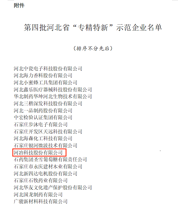 2021年12月30日,河北省工業和信息化廳發布了《關于公布第四批河北省“專精特新”示范企業的通知》(冀工信企業函〔2021〕1029號)。通過前期申報,河冶科技股份有限公司通過了市級、省級的嚴格審核,被認定為河北省“專精特新”示范企業。