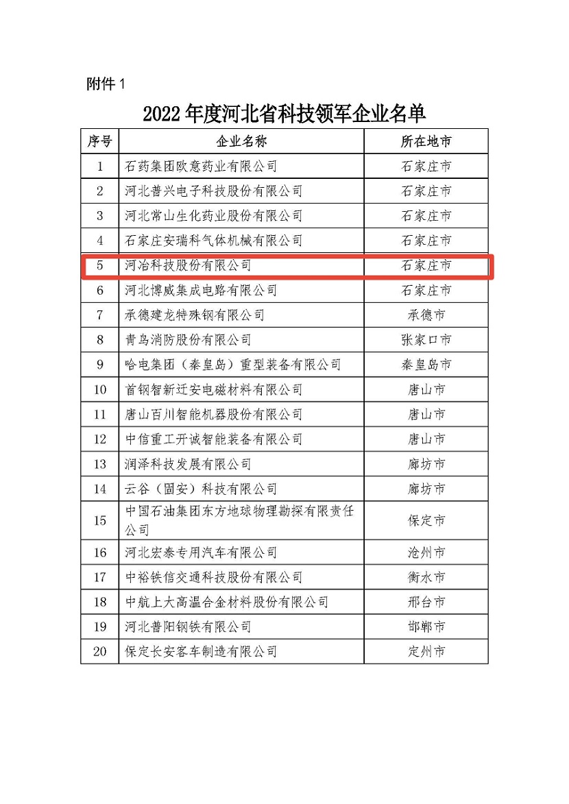 近日,河北省科技廳發布《關于公布2022年度認定河北省科技領軍企業和列入科技領軍企業培育庫企業的通知》,我公司經推薦、評審、公示,成功被認定為“河北省科技領軍企業”。